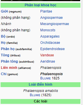 Lan hồ điêp Phalaenopsis thuộc chi lan chứa khoản 60 loài. Đây là một trong những chi hoa lan phổ biến nhất trong thương mại với việc phát triển nhiều loài lai nhân tạo.