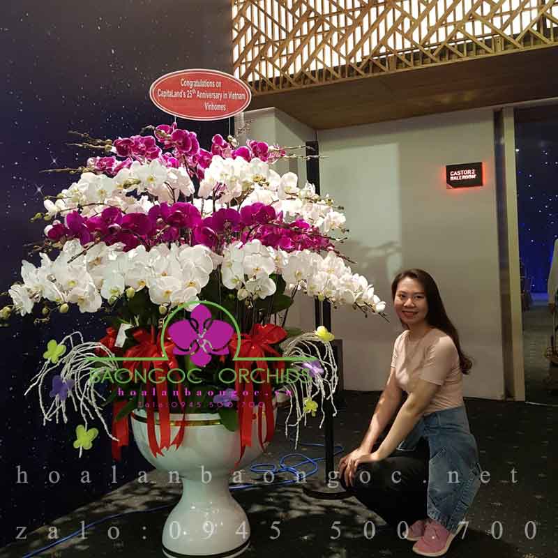 -Chậu lan hồ điệp 68 cành, kết hợp đan xen của 3 sắc màu: lan hồ điệp trắng, hoa phong lan tím, lan hồ điệp tím đột biến.