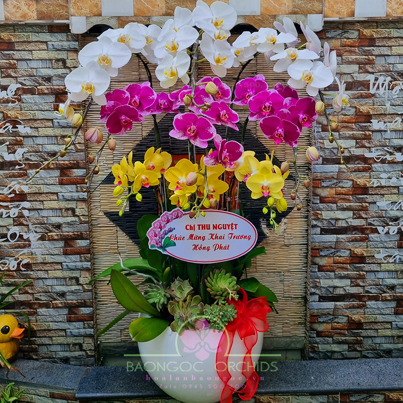 Chậu hoa lan hồ điệp mừng ngày thành lập công ty, được thiết kế bởi Hoa Lan Bảo Ngọc gồm 3 màu hoa lan hồ điệp: