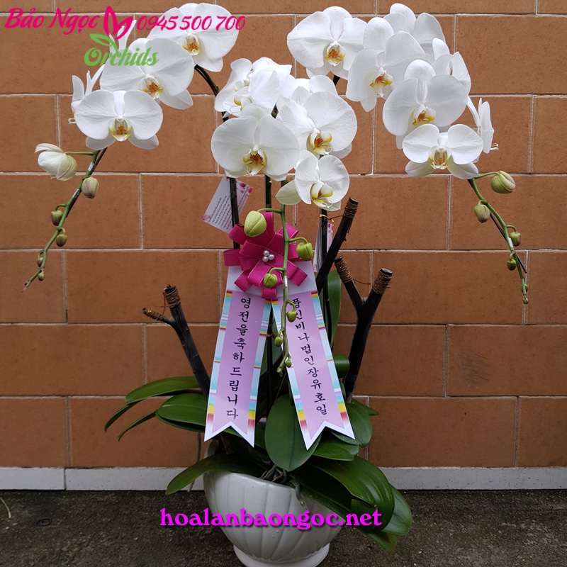 Chậu hoa lan trắng phong cách Hàn Quốc: Chậu Lan Hồ điệp trắng đẹp, trang trí nơ màu trầm sang trọng, phong cách Hàn Quốc lịch thiệp, nhã nhẹn. Mẫu hoa này thích hợp làm quà mừng tân gia, quà chúc mừng khai trương cửa hàng, quà chúc mừng sinh nhật đối tác.