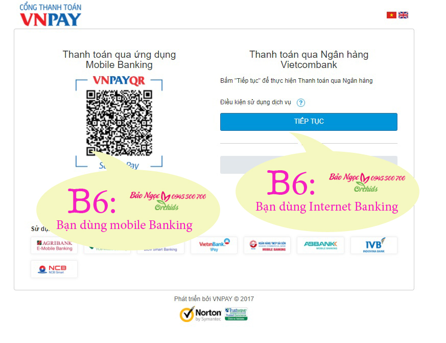 + Quý Khách thanh toán bằng cách quét mã VNPAYQR nếu dùng MobilBanking - hoặc chọn đăng nhập vào tài khoản Internet Banking