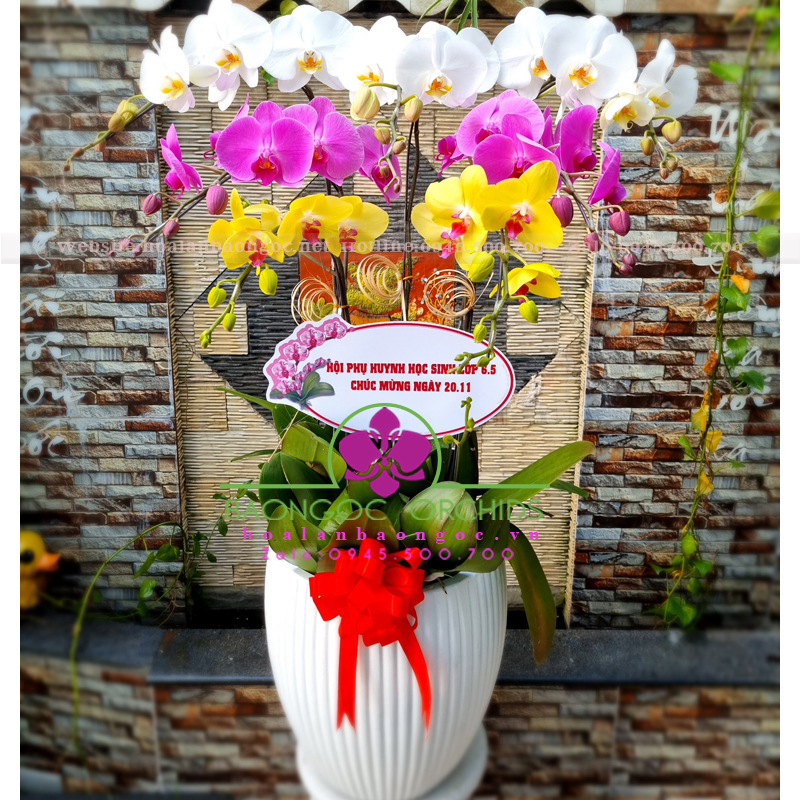 Chậu lan hồ điệp trắng, vàng, hồng, tím: 7 cành được thiết kế bởi Hoa Lan Bảo Ngọc